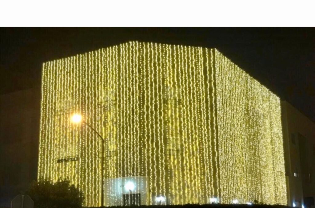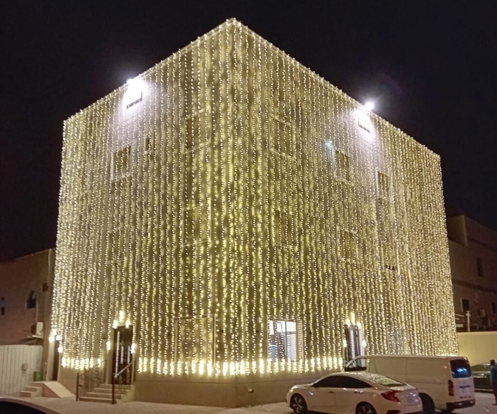 - الستائر الضوئية (Curtain Lights): لتغطية واجهات المنازل والجدران بشلالات من النور.